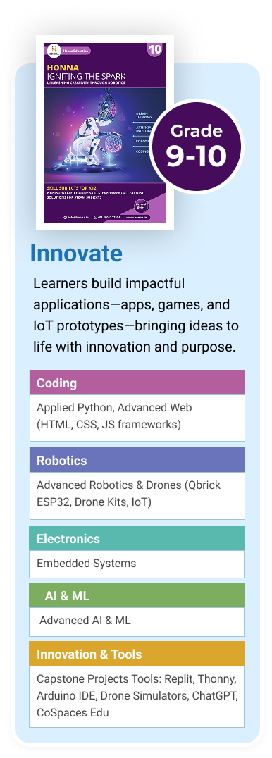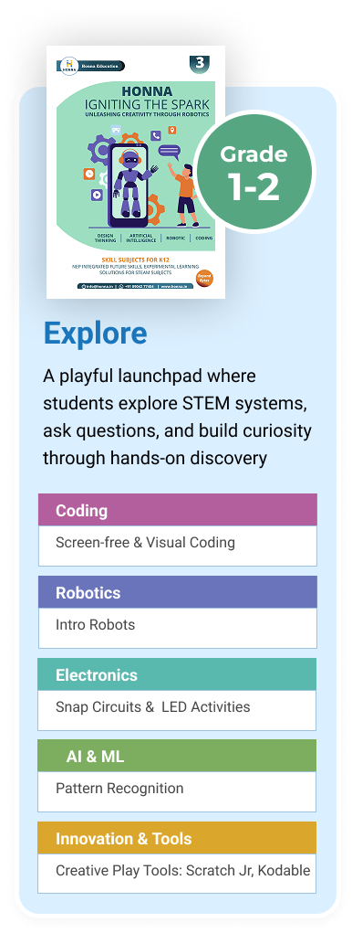 At Honna Education, our STEM program is more than just coding—it’s a guided journey of exploration, logic, and purposeful creation. Aligned with NEP 2020, each stage builds age-appropriate skills in technology, design thinking, and ethical innovation.